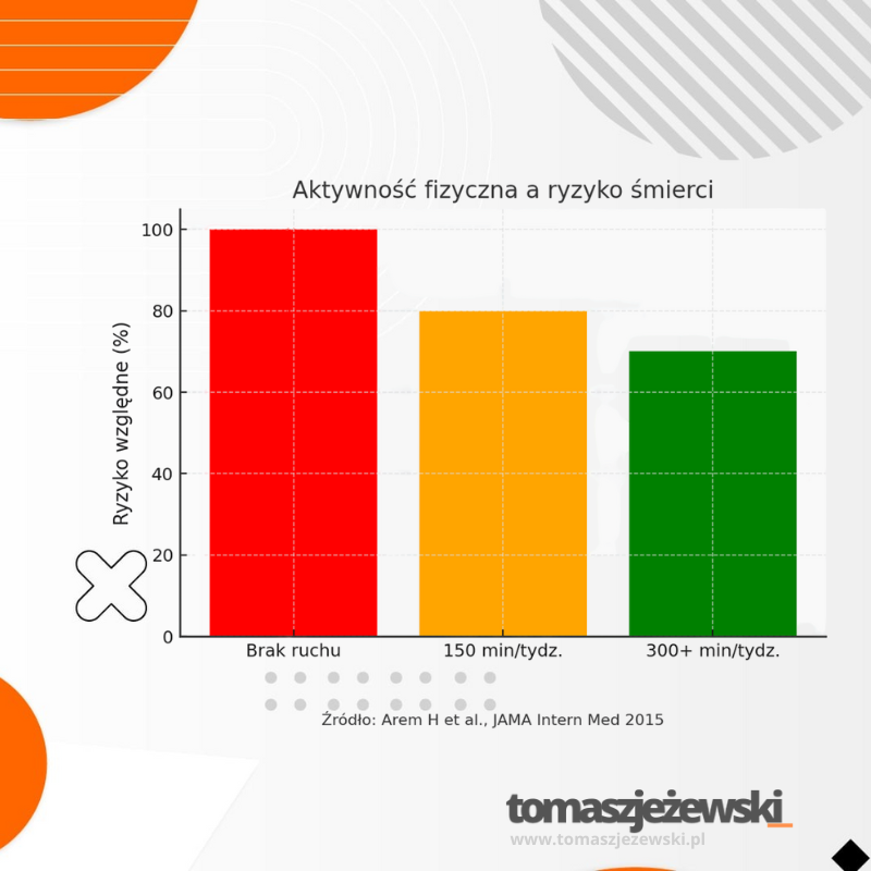 Wielu z nas tłumaczy się brakiem czasu na sport, ale nauka mówi jasno – już 150 minut umiarkowanej aktywności tygodniowo (np. 5 szybkich spacerów po 30 minut) znacząco zmniejsza ryzyko chorób serca i przedwczesnej śmierci. To mniej niż czas, który przeciętnie spędzamy w ciągu tygodnia na oglądaniu seriali czy korzystaniu z telefonu. Ruch działa jak najlepsze lekarstwo – obniża ciśnienie, poprawia poziom cholesterolu, reguluje poziom cukru i redukuje stres. Im więcej się ruszasz, tym większe korzyści: przy 300 minutach tygodniowo zyskujesz jeszcze lepszą ochronę. Nie trzeba być maratończykiem, żeby czerpać zyski – wystarczy regularność i włączenie aktywności w codzienny rytm.