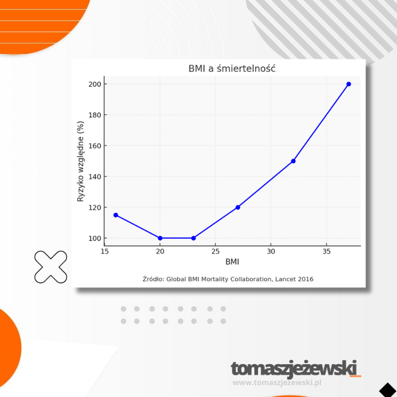 BMI, czyli wskaźnik masy ciała, to jedno z najprostszych narzędzi oceny ryzyka chorób przewlekłych. Wynik 18,5–24,9 oznacza najniższe ryzyko, natomiast wartości powyżej 25 wiążą się z nadwagą i rosnącym prawdopodobieństwem rozwoju cukrzycy, nadciśnienia czy chorób serca. Przy BMI ≥30 mówimy o otyłości, która dwukrotnie, a nawet trzykrotnie zwiększa ryzyko poważnych chorób metabolicznych i skraca oczekiwaną długość życia. Co ważne, także niedowaga (BMI <18,5) podnosi ryzyko zgonu, głównie z powodu osłabienia odporności i większej podatności na infekcje. Utrzymywanie BMI w normie to jeden z najprostszych i najskuteczniejszych sposobów dbania o zdrowie.