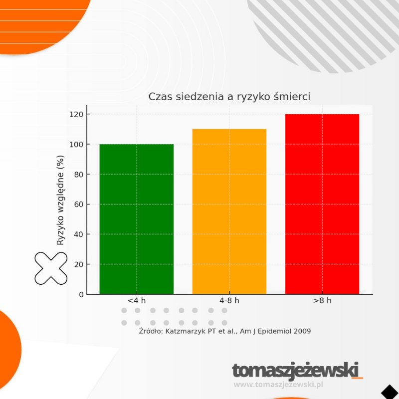 Współczesny styl życia sprawia, że przeciętnie spędzamy w pozycji siedzącej nawet 8–10 godzin dziennie. Badania jasno pokazują, że już powyżej 8 godzin siedzenia dziennie ryzyko przedwczesnej śmierci rośnie o 20%, niezależnie od masy ciała czy aktywności fizycznej w pozostałym czasie. Długotrwałe siedzenie spowalnia metabolizm, podnosi poziom cukru i cholesterolu oraz zwiększa ryzyko zakrzepów. Nawet krótkie przerwy w pracy – wstanie, rozciągnięcie się czy krótki spacer – znacząco zmniejszają to ryzyko. Regularny ruch w ciągu dnia to najprostszy sposób, by „rozbroić” cichego zabójcę, jakim jest siedzenie.